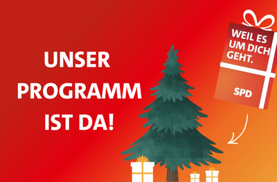 Die Feiertage stehen vor der Tür und wir haben ein ganz besonderes „Geschenk“ für Baden-Württemberg: Unser Wahlprogramm! Unter der Überschrift „Weil es um Dich geht“ zeigen wir, wie wir dieses Land gestalten wollen. Mit sicheren Arbeitsplätzen, bezahlbarem Wohnen und Bildung, die allen die gleichen Chancen eröffnet.